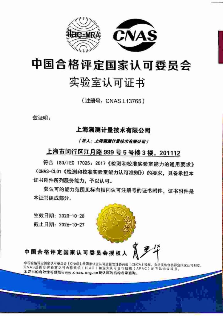 上海溯测计量技术有限公司计量实验室成立于2016年,严格按照ISO17025准则建立,并顺利通过了中国合格评定国家认可委员会(CNAS)的认可,中心聘请了上海市计量测试技术研究院专家作为技术顾问,聚集了一批长期从事计量检定、校准的专业技术人才,配置了国内一流的计量标准设备。
